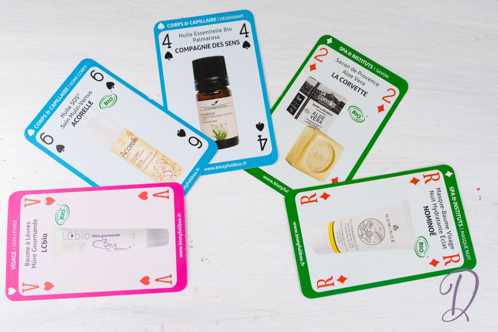 Ce mois-ci, la Biotyfull s’appelle « La florale ». Je trouve que le packaging est vraiment réussi, avec des tons parme. On trouve dans cette box des cartes à jouer qui décrivent les produits.
