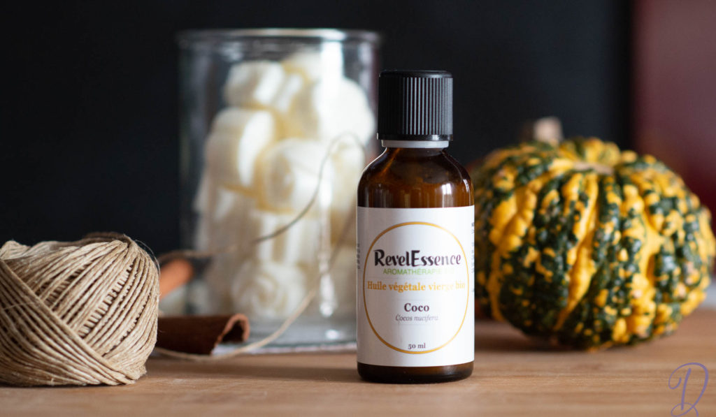 1. Faites fondre au bain-marie les copeaux de cire de soja ainsi que l’huile végétale de coco