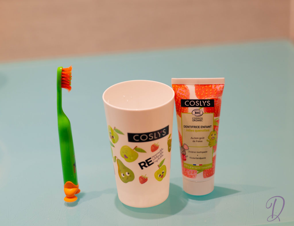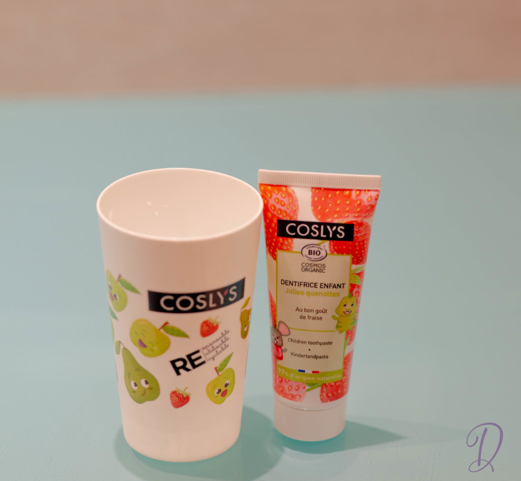 Il contient du thé vert bio et de la camomille bio qui apaisent et prennent soin des gencives des tout-petits. Mon fils l’adore : le lavage des dents n’est plus une corvée ! Nous avons aussi reçu un joli gobelet à dents Coslys.
