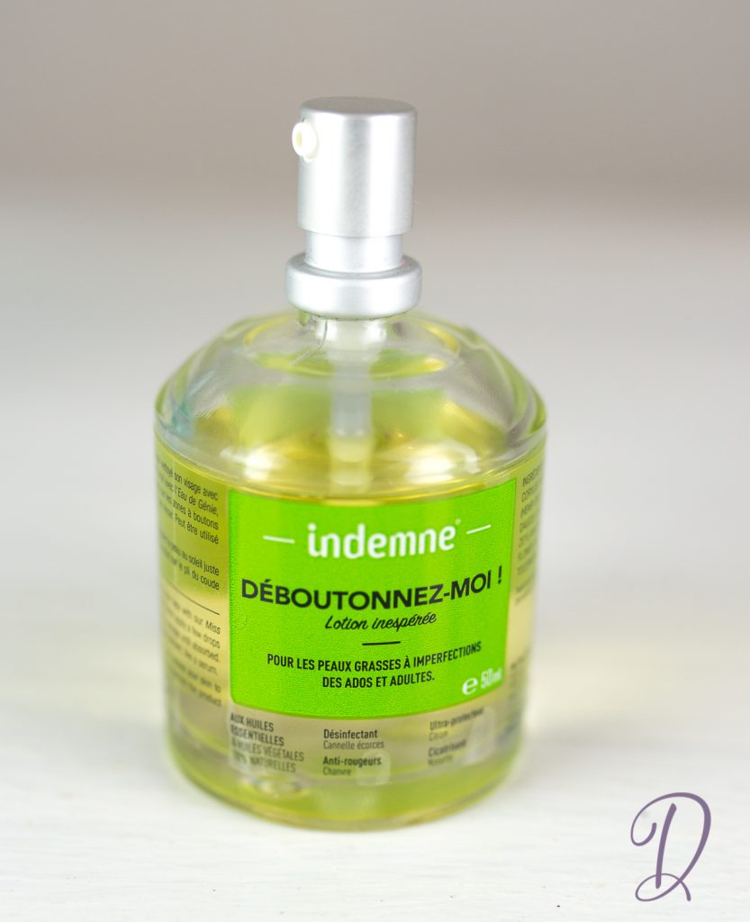 5) Pour mes imperfections, j’utilise la lotion « Déboutonnez-moi ! » de la marque Indemne. Cette lotion est recommandée pour les peaux à imperfection, acnéiques, et les peaux grasses. Elle purifie la peau, libère les pores et réduit l’excès de sébum. Une à deux gouttes suffisent pour l’ensemble du visage. Cette lotion ne laisse aucun film gras.