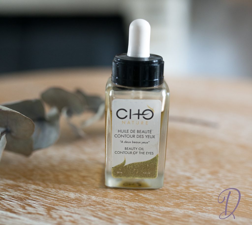 4) J’applique de l’huile de beauté contour des yeux de Cho Nature. C’est un soin triple action que j’utilise matin et soir ; j’en dépose quelques gouttes sur le contour de l’œil, j’effectue un léger massage pour favoriser la circulation sanguine.