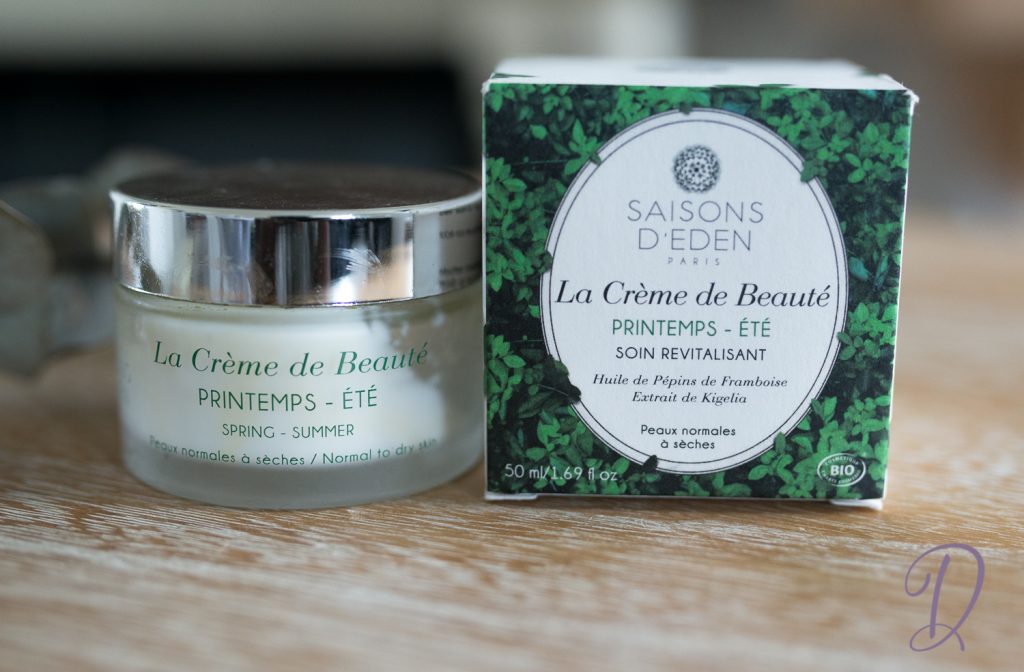 3) J’applique ensuite une crème pour le visage Saisons d’Eden Printemps-Eté. C’est un soin revitalisant gorgé d’actifs antioxydants et d’acides gras essentiels comme l’huile de pépins de framboise, de gel d’aloé vera et de sésame.
