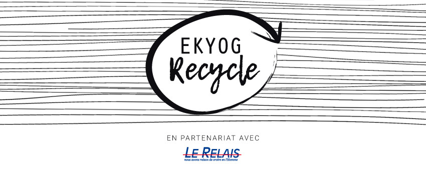 Dans les boutiques de la marque il est possible de rapporter tous ses vêtements dans un but de recyclage. C’est le principe du « Ekyog recycle ». Les vêtements que vous déposez en boutique sont collectés, triés et ensuite réutilisés, ce qui limite grandement la production de déchets. La marque a mis en place ce système en partenariat avec le réseau d’entreprise LE RELAIS.