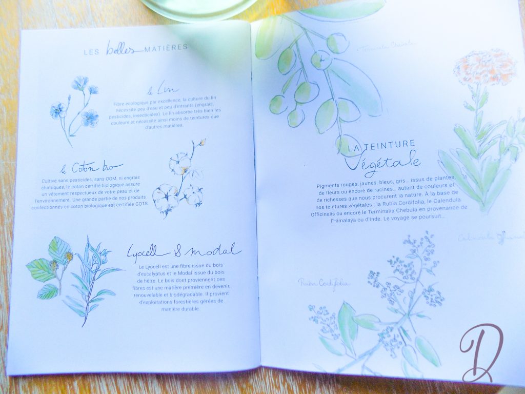 La marque utilise des matières spécialement choisies pour leurs atouts biologiques et leur respect de l’environnement. Que ce soient le coton biologique (certifié GOTS), le lin (fibre écologique), le modal ou le lyocell (issue du bois d’eucalyptus), les fibres