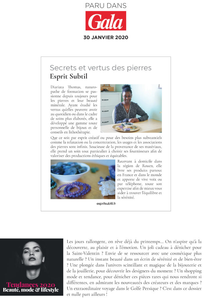 Voilà, c’est à peu près tout. Mais cela vous intéressera peut-être de savoir que je ne consomme plus aucun produit d’origine animale depuis un an, à l’exception du miel. Mais aussi que je pratique la course à pied depuis 15 ans, et suis une adepte de yoga et de méditation. Par ailleurs, la Lithothérapie est une véritable passion pour moi. J’ai crée une boutique en ligne Esprit Subtil