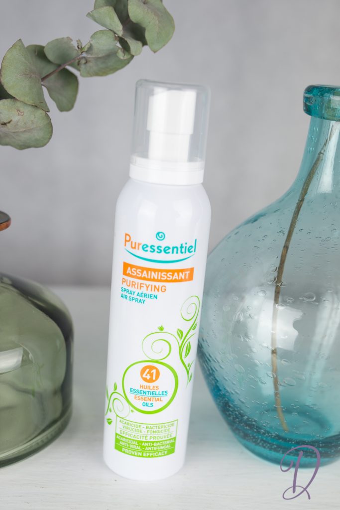 Je vais vous présenter le spray aérien assainissant. Présenté dans un flacon de 200 ml, il est formulé avec 41 huiles essentielles 100 % naturelles de Puressentiel. Ce spray aérien aux propriétés acaricides, bactéricides, fongicides et virucides assainit l’air de votre maison, de votre voiture et de votre bureau ; il aide à chasser les acariens, les germes (bactéries, virus, champignons microscopiques) et les mauvaises odeurs. Ce spray est présenté dans un flacon de couleur blanche, les couleurs dominantes sont l’orange, le vert et le bleu.