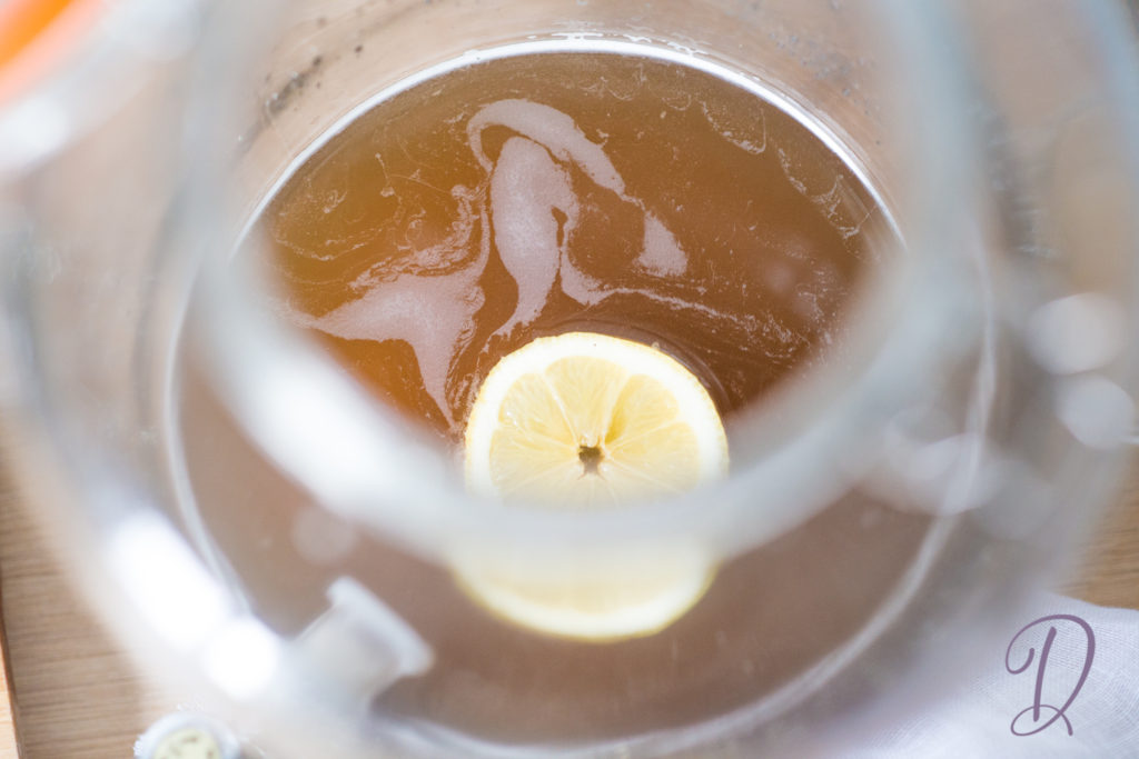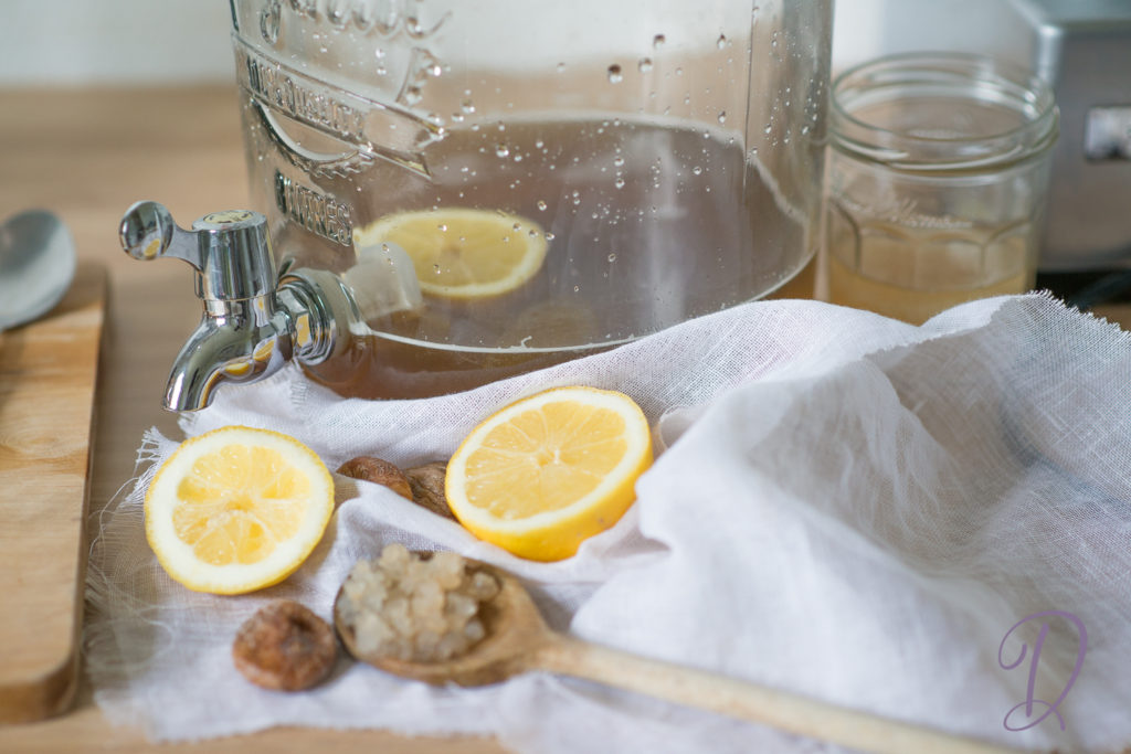 - Quand les figues seront remontées à la surface : fermentation F1 (pour la première fermentation, comptez entre 24 à 36 h). Attendez encore 12 h, puis jetez les rondelles de citron et les figues.